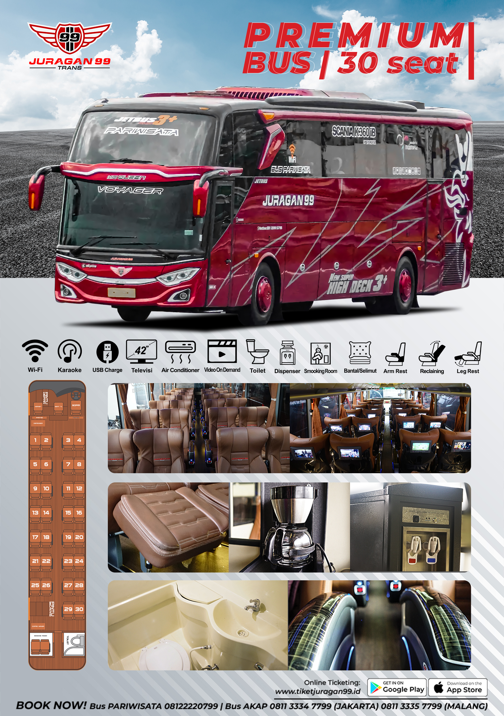 Premium Bus Juragan 99 Trans dilengkapi dengan kursi nyaman beserta pijakan kaki, TV Screen, dan layanan kelas Premium lainnya untuk perjalanan yang menyenangkan. Armada kami selalu menerima perawatan rutin untuk menjaga kualitas dan kenyamanan saat digunakan.